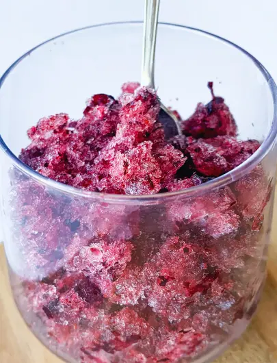 - Remove and scrape with a fork to break up any frozen chunks. Place back in freezer.