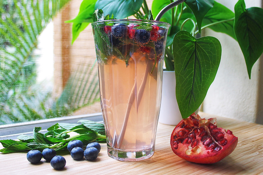1. Add blueberries, pomegranate and mint leaves to a glass. Pour over coconut water and enjoy!