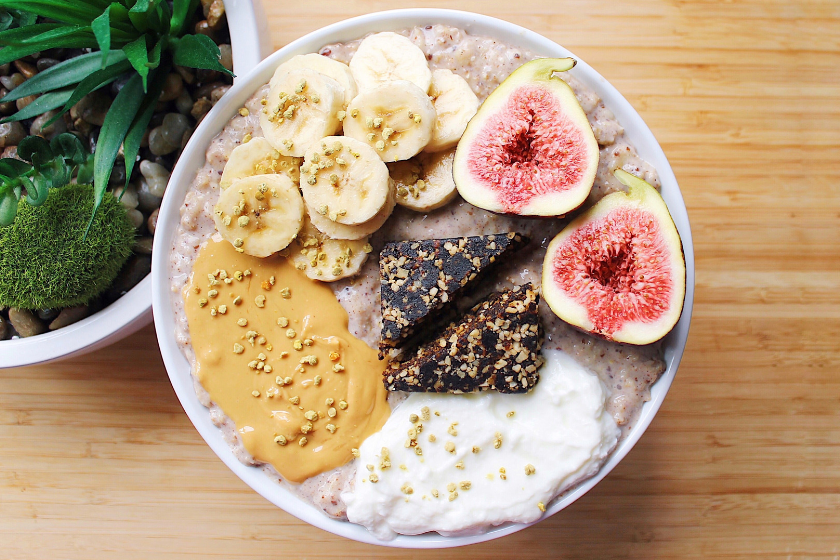 - Pour into a serving bowl and top with fruit, yoghurt, peanut butter, bee pollen and a Blue Dinosaur Espresso Bites bar