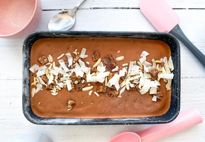 3. Break up Shelby’s Salted Caramel, Peanut Butter & Dark Chocolate Bar into small bite-sized pieces and mix through ice-cream using a spoon.