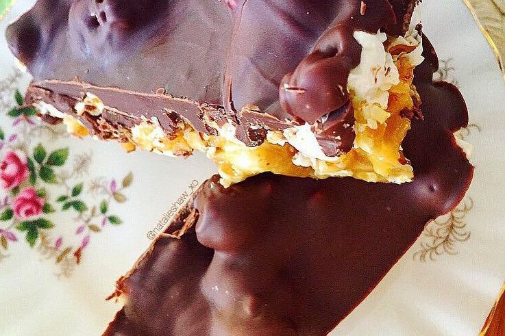 - Melt/make chocolate and spread over the contents until covered. Place in fridge to set. Devour.