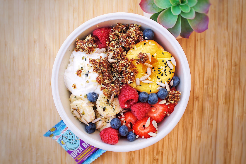 1. Spoon yoghurt in the serving bowl and add all the remaining ingredients including 1 crumbled Blue Dinosaur bar.