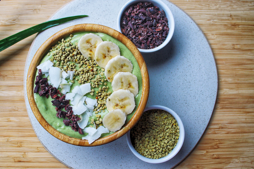 - Toppings banana, cacao nibs, bee pollen, coconut flakes