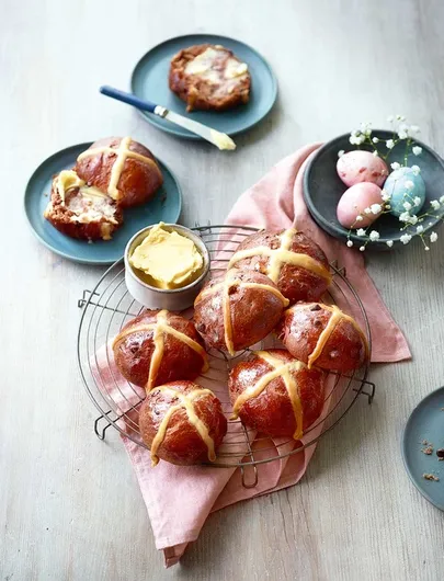 - Meanwhile, mix the remaining flour, xanthan gum and water together in a small bowl until a smooth paste forms. Place the mixture in a piping bag (or a small plastic bag with the end snipped off), and pipe a vertical & horizontal line down the centre of each row of buns, to form crosses. Bake in preheated oven for 10 minutes. Reduce heat to 180 degrees and bake for a further 20 minutes or until golden and cooked through.