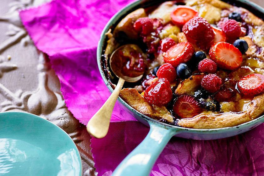 - Bake for 20-25mins or until puffed and golden. To serve, slice into wedges and top with extra rice malt syrup and berries.