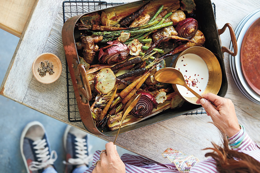 This prebiotic bake is pimped up with a tangy garlic tahini drizzle. Roasting is a great way to cheer up any vegetable that may have been left in the fridge too long. The vegetables all cook at different speeds, so some are crunchier than others, which adds to the beauty of this dish.