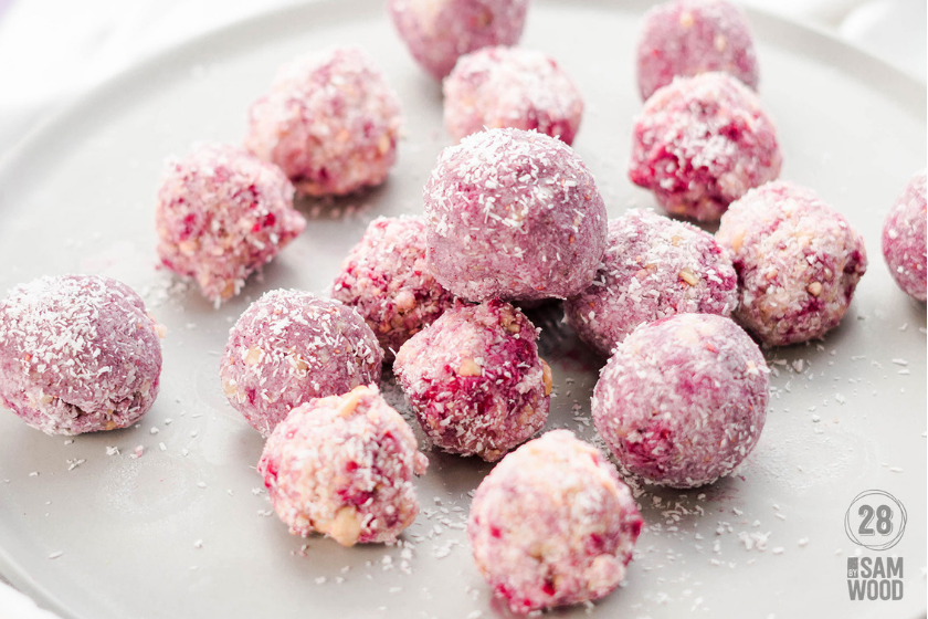 - Add the coconut, raspberries, protein powder and lemon zest. Mix to combine