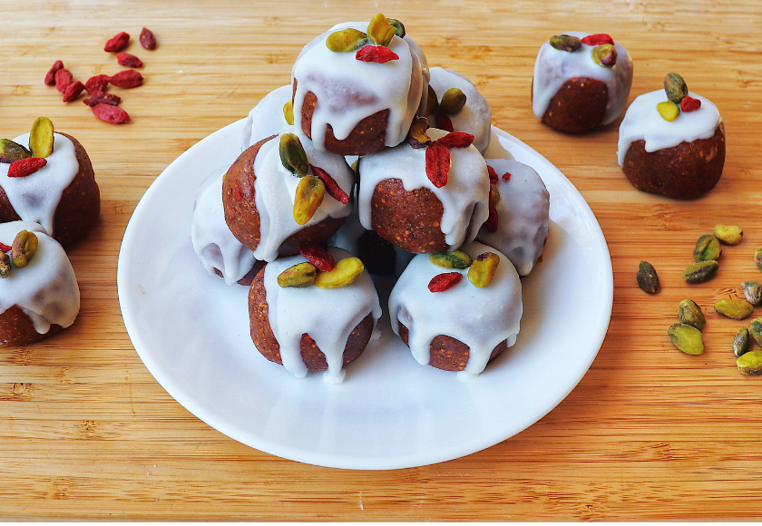 - Mix together the coconut butter and peppermint extract in a small bowl and spoon 1 tsp over the tops of the truffles. Top with goji berries and pistachio nuts.
