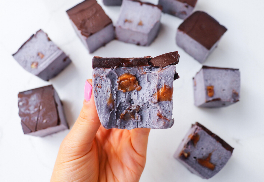 7. Remove the blueberry fudge from the tin, slice and enjoy.