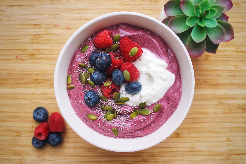 1. Blend until smooth and creamy. Top with berries, yoghurt and seeds.