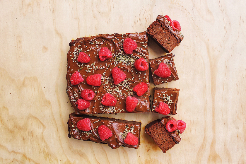 - Spread over the brownie, sprinkle with hemp seeds and raspberries.