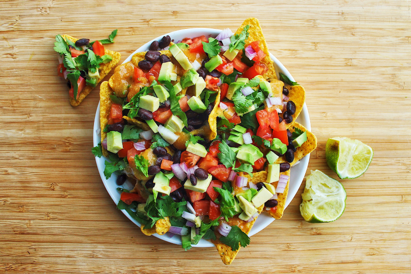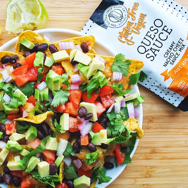 Get ready for the most delicious vegan nachos using The Gluten Free Co Queso Sauce. Salty, crunchy tortilla chips, black beans and avocado all covered in a healthy layer of creamy cheesy queso!