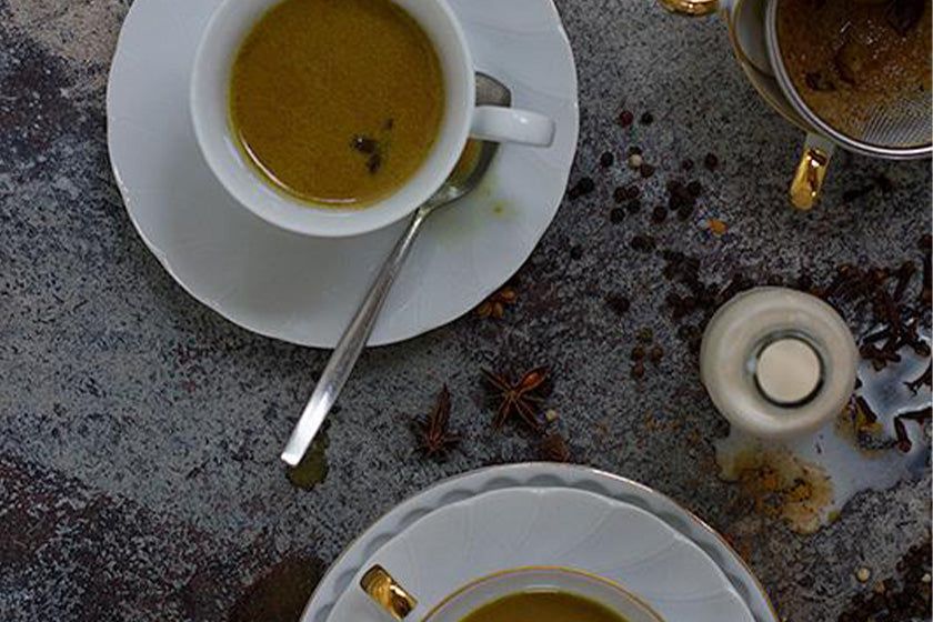 - Place water and milk in a saucepan and add all spices with the Organic Ginger Syrup.
