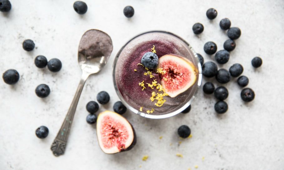 4. Scoop mousse equally into two 125ml capacity dessert cups/jars. Cover with cling film and refrigerate for 2 hours. Top with fresh blueberries, figs and dust with blueberry powder before serving.