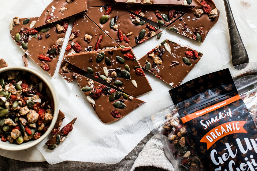 This is a recipe you do not want to miss out on! This homemade chocolate bark is created with a few essential ingredients - dark chocolate, coconut oil, vanilla essence and Murray River Organic's Get Up & Goji. Perfect to share with family and friends (or eat it all yourself).