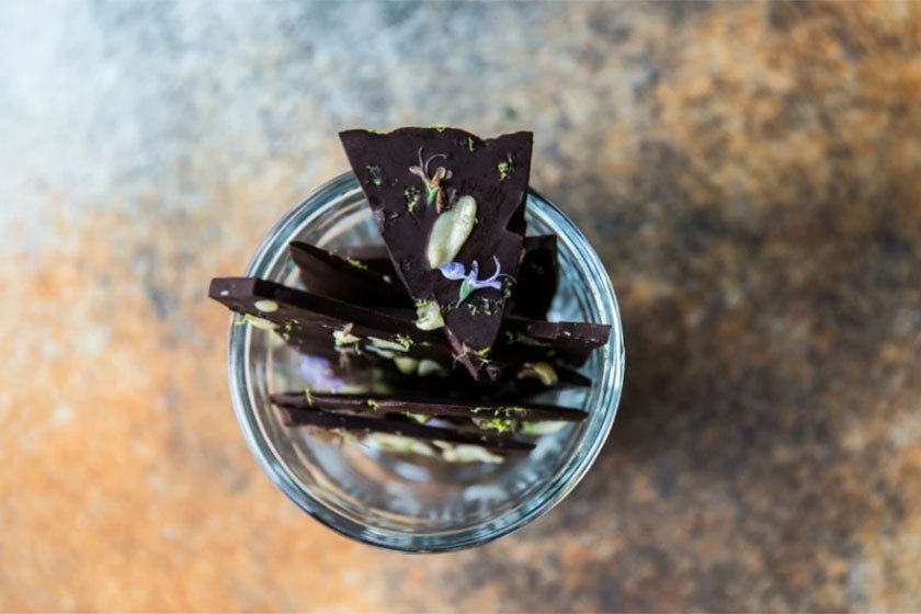 - Scatter crushed peanuts, lime zest and rosemary/lavender flowers over the melted chocolate.