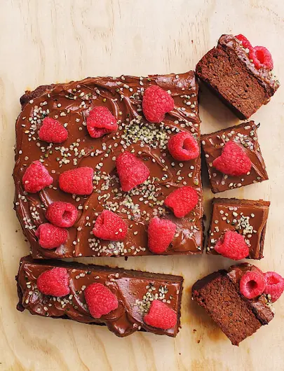 - Spread over the brownie, sprinkle with hemp seeds and raspberries.